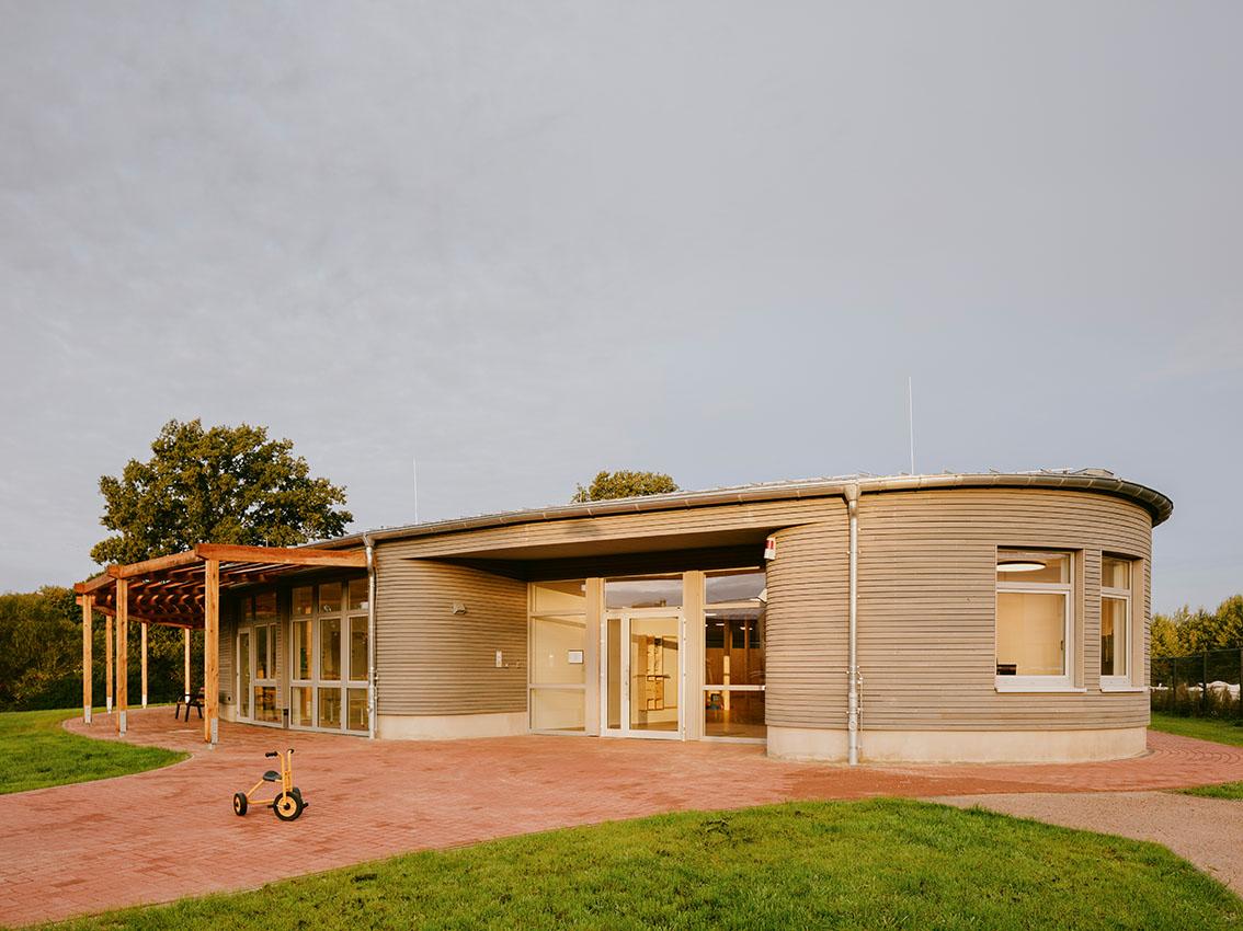 Die ASB Kita Bachlinge öffnete am 01.09.2022 ihre Pforten. Die vom Architekten Jan Braker designte Kita fügt sich futuristisch in die naturbelassene Umgebung ein und glänzt mit modernster Technik, kombiniert mit nachhaltiger Holzbauweise.